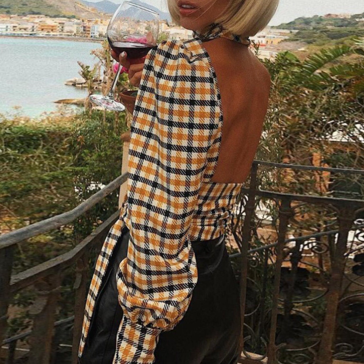 Women's Casual Backless Korean Version Versatile Checkered Top